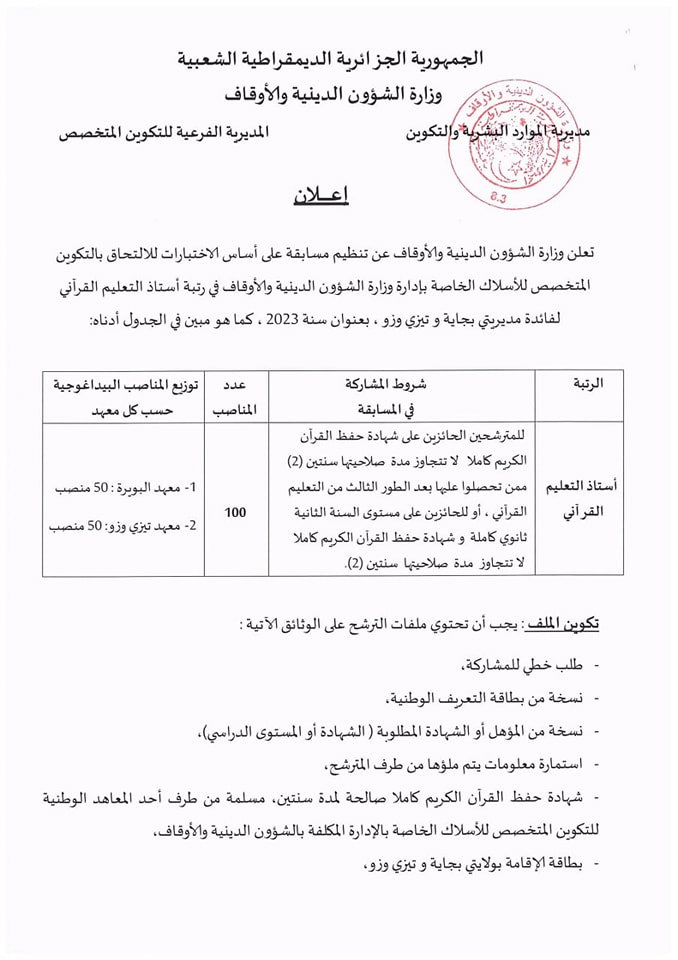 أعلنت وزارة الشؤون الدينية والأوقاف، اليوم الإثنين، عن تنظيم مسابقة على أساس الاختبارات للالتحاق بالتكوين المتخصص للأسلاك الخاصة. بإدارة وزارة الشؤون الدينية والأوقاف في رتبة أستاذ التعليم القرآني لفائدة مديريتي بجاية وتيزي وزو، بعنوان سنة 2023.