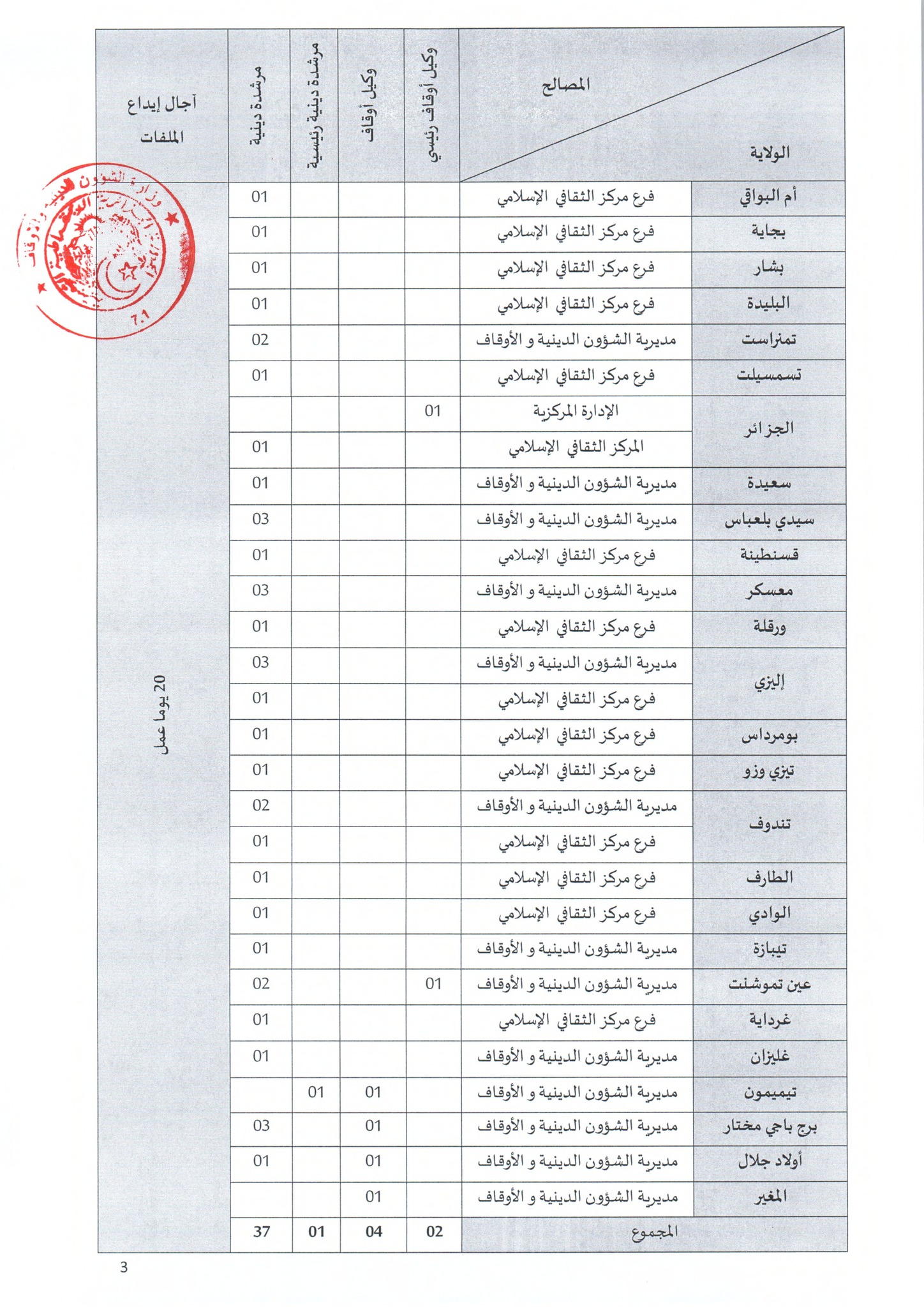 و أوضحت الوزارة في بيان لها، أن ملف الترشح يودع لدى المصالح المعنية بالمسابقات، الإدارة المركزية : مديرية الموارد البشرية والتكوين -. المديرية الفرعية للموارد البشرية والمسابقات بوزارة. الشؤون الدينية والأوقاف. شارع طرابلس المقرية - الجزائر، المركز الثقافي الإسلامي : 12 شارع علي بو منجل – الجزائر.