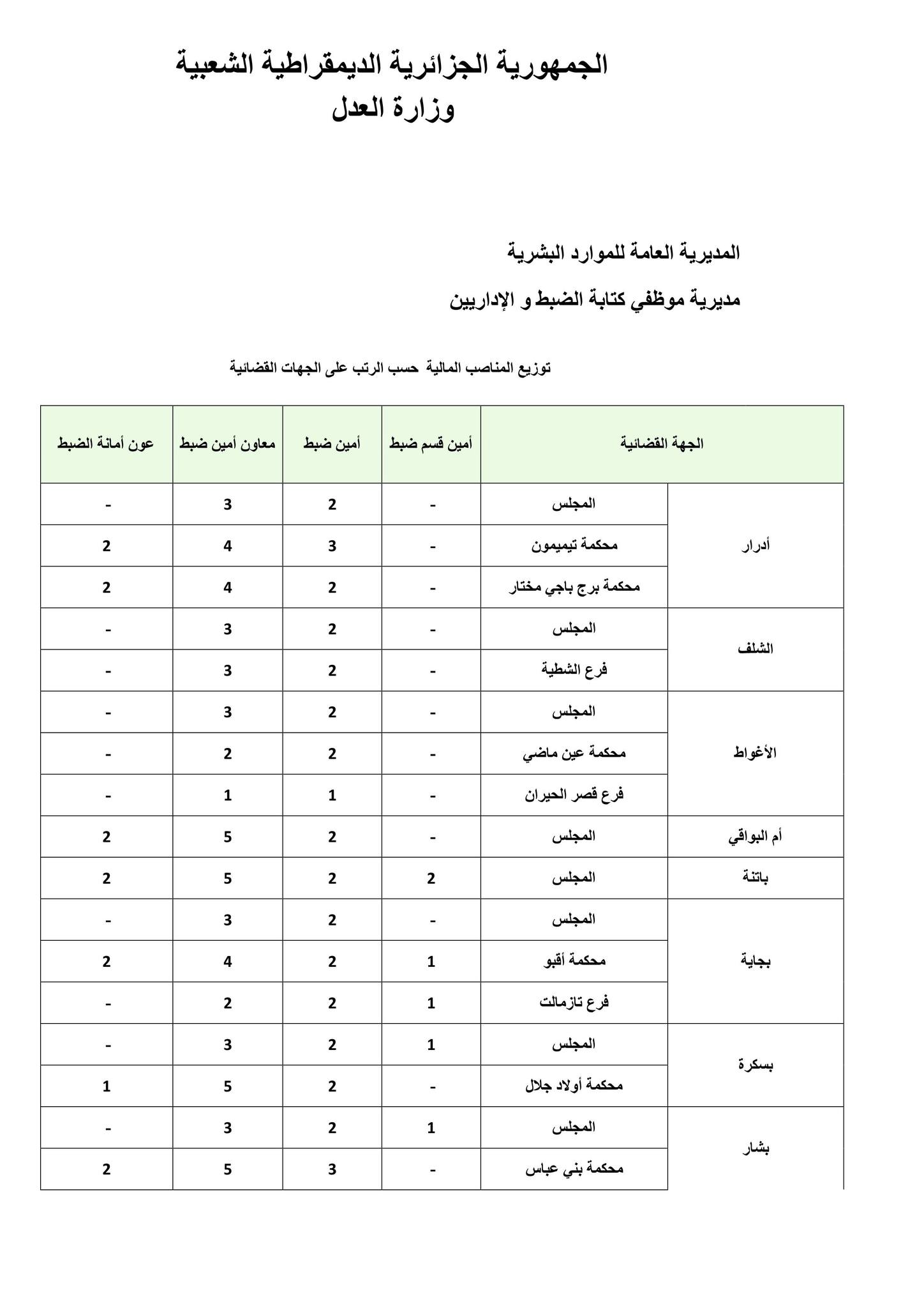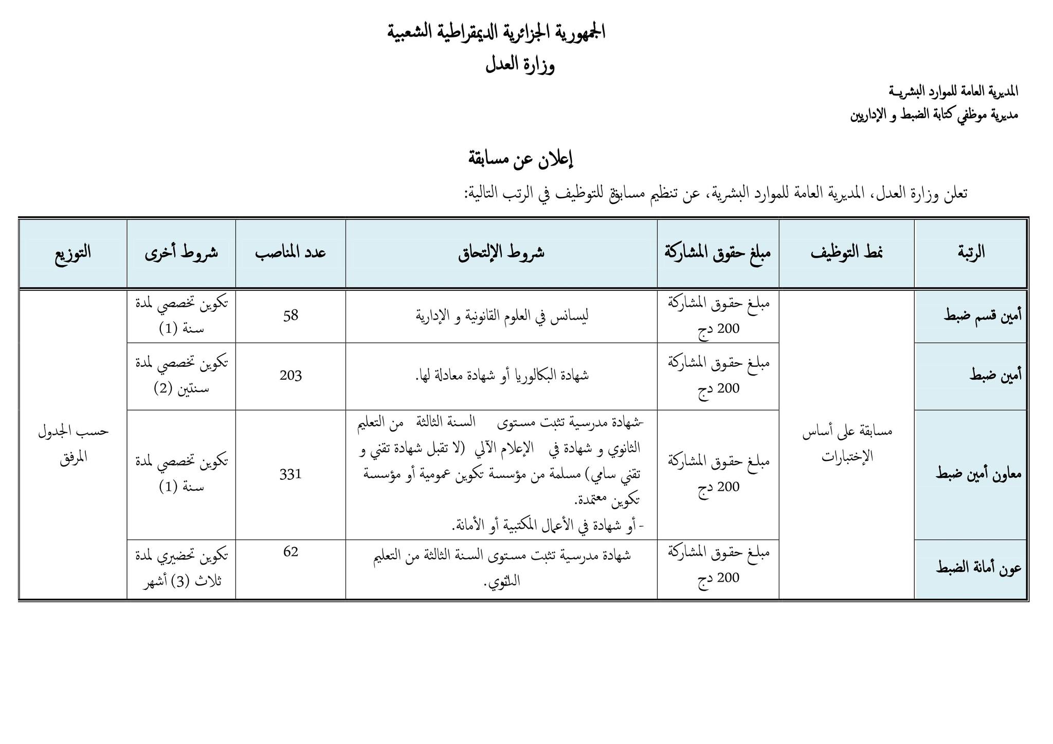 كما تشمل المسابقة أيضا توظيف 331 معاون أمين ضبط من ذوي مستوى الثالثة ثانوي مع شهادة في الإعلام الآلي أو الأعمال المكتبية، بالإضافة إلى توظيف 62 عون أمانة ضبط من ذوي مستوى الثالثة ثانوي. يضيف المصدر نفسه.