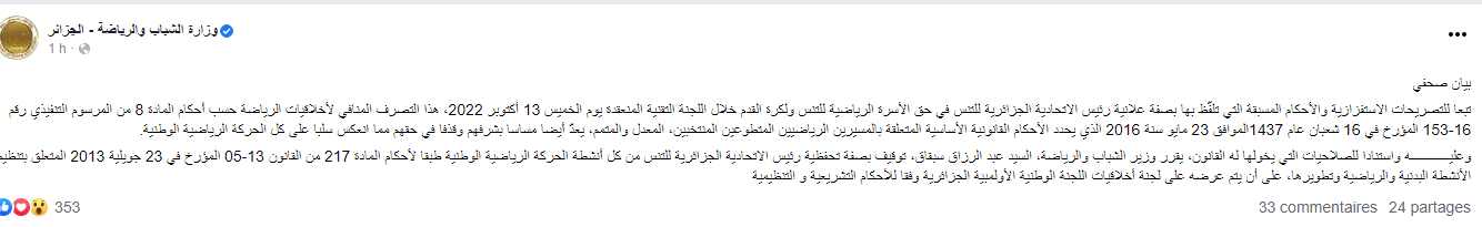 واعتبر بيان الوزارة أن التصريحات التي أدلى بها رئيس الاتحادية الجزائرية للتنس منافية لأخلاقيات الرياضة.