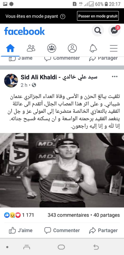 ونشر “خالدي” رسالة التعزية على صفحته الشخصية في الفايسبوك:”تلقيت ببالغ الحزن و الأسى وفاة العداء الجزائري عثمان شيباني. وعلى اثر هذا المصاب الجلل، أتقدم الى عائلة الفقيد بالتعازي الخالصة إنا لله و إنا إليه راجعون”.