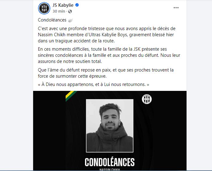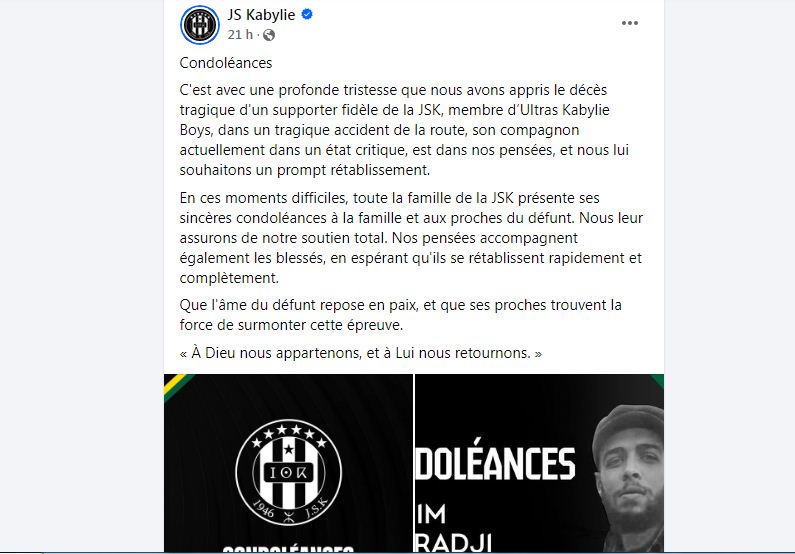 وقدمت إدارة شبيبة القبائل، تعازيها إلى المناصر وعضو “كابيلي بويز” رحيم دراجي، الذي توفي بعين المكان، بينما تم نقل صديقه الآخر. المدعو “نسيم شيخ” إلى المستشفى، في حالة حرجة.