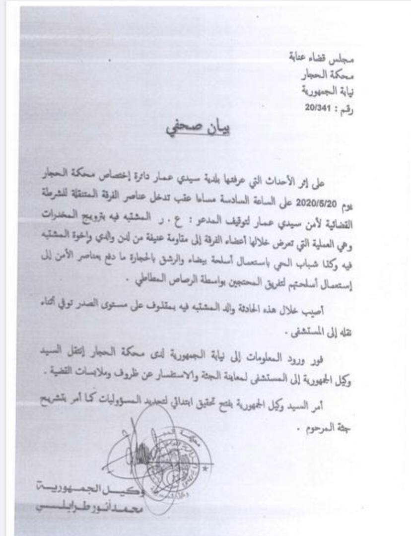 أصدر وكيل الجمهورية لدى محكمة الحجار في عنابة، بيانا يوضح فيه ما حدث في سيدي عمار بعنابة ليلة أمس.