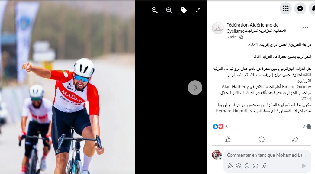 وأشارت الاتحادية الجزائرية للدراجات، في منشور عبر صفحتها الرسمية على “فيسبوك” اليوم الثلاثاء. إلى أن اختيار ياسين حمزة. للمشاركة في جائزة أحسن دراج في 2024. عقب تألقه في المنافسات القارية لذات السنة.