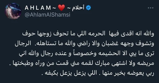 وأعادت أحلام من ناحيتها مشاركة التغريدة، وعقبت عليها داعمة الرجل، حيث انتقدت تصرف زوجته الذي وصفته بأنه إهانة لزوجها.
