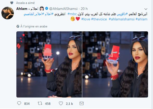 وقالت “أحلام” في تغريدة لها عبر تويتر “البرنامج العالمي “ذافويس” على شاشة كل العرب، بيتي الأول mbc، انتظروني”.