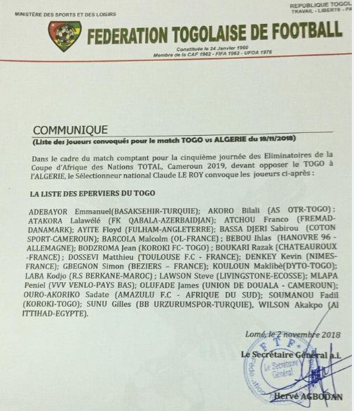 وضمت التشكيلة التي كشف عنها مدرب منتخب الطوغو، كلود لوروا، تحسبا لمواجهة الجزائر، كل من: