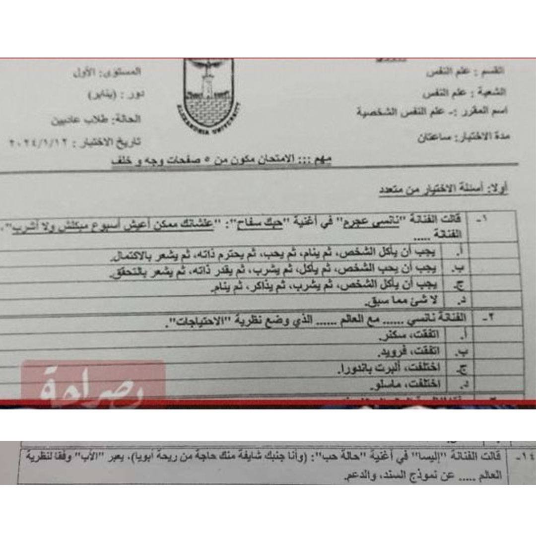 وتفاجأ طلاب كلية الآداب في جامعة الإسكندرية، في مصر، بأوراق امتحاناتهم، بعدما قررت أستاذة قسم علم النفس الشخصي الاستعانة بمقتطفات من أغنيتي “حبك سفاح” و”حالة حب”.