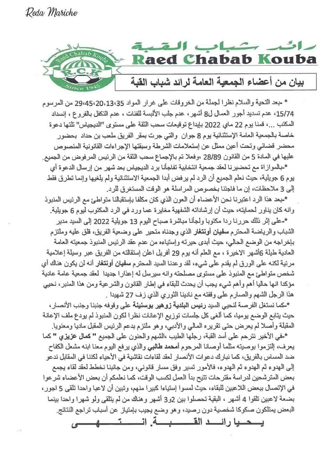 أصدر أعضاء الجمعية العامة لفريق رائد القبة بيانا شرحوا فيه وضعية الفريق والاجراءات التي قاموا بها لتنحية المكتب السابق.