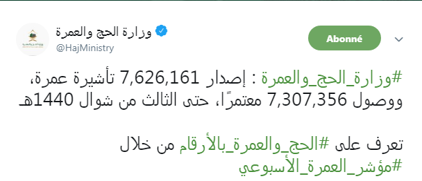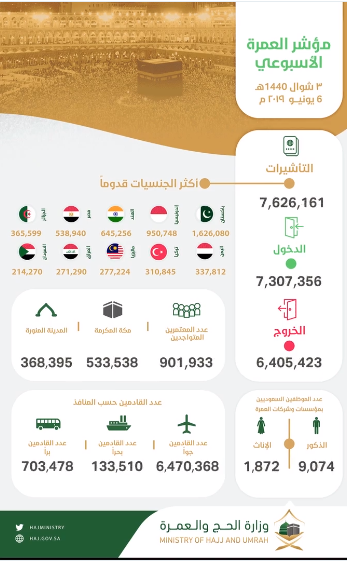 و500 جزائري على تأشيرة العمرة حتى نهار أمس 6 جوان 2019، في وقت تجاوز عددهم 400 ألف معتمر حتى منتصف