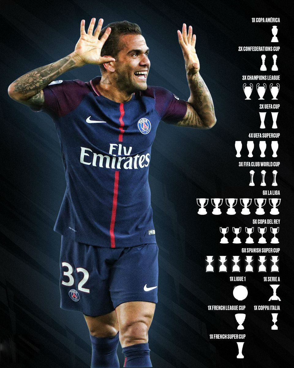 دخل البرازيلي “داني ألفيش” تاريخ كرة القدم من بابه الواسع، بعد تتويجه رفقة باريس سان جيرمان بلقب البطولة الفرنسية يوم أمس.