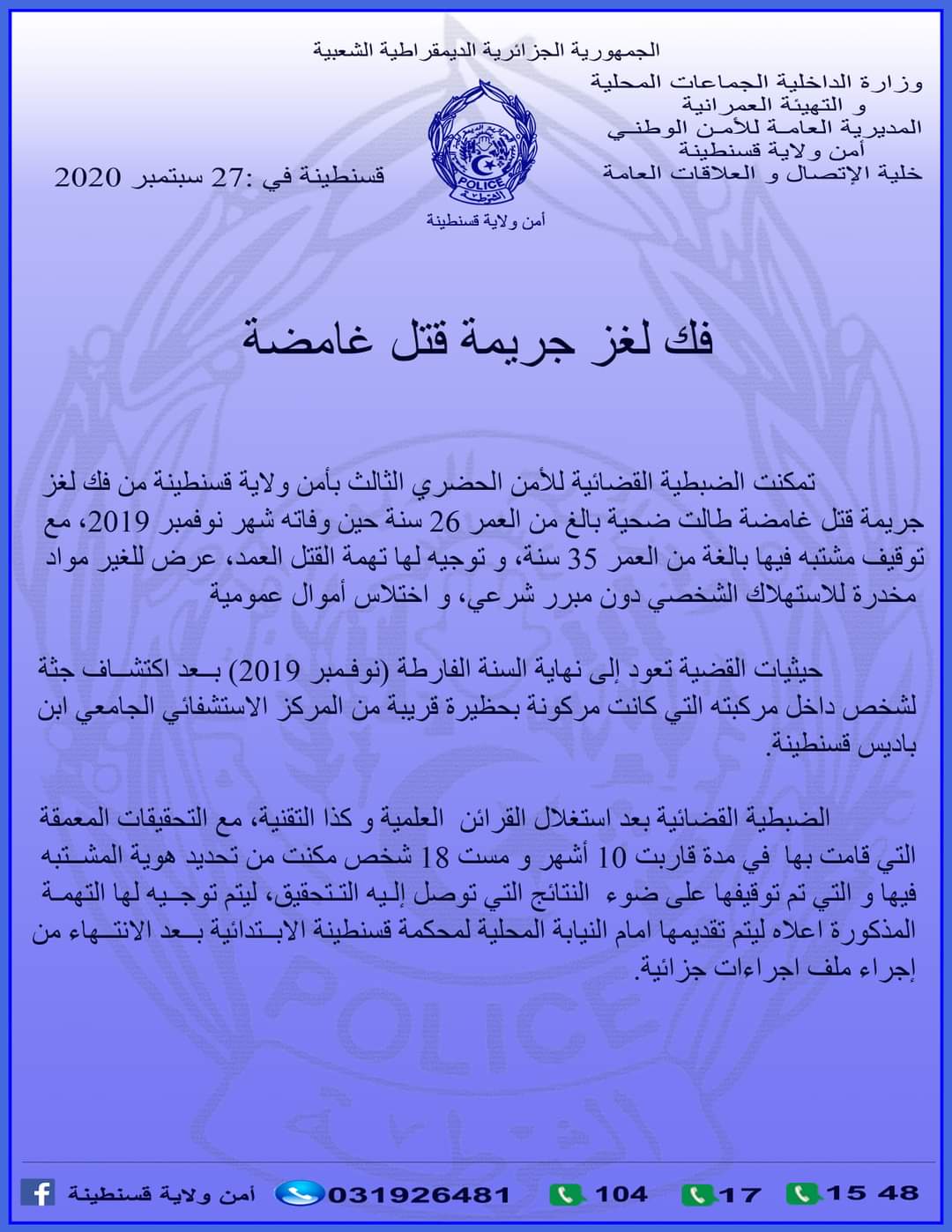 نجحت مصالح أمن ولاية قسنطينة، في تفكيك لغز جريمة راح ضحيتها شاب يبلغ من العمر 26 سنة عثر عليه مقتولا داخل مركبته بحظيرة قريبة من المركز الإستشفائي الجامعي ابن باديس بقسنطينة.