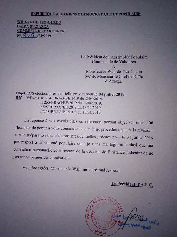ومن جهته، وجه رئيس بلدية “اعكوران” في رسالة إلى والي تيزي وزو، أنه يرفض المشاركة في تنظيم رئاسيات 4 جويلية.