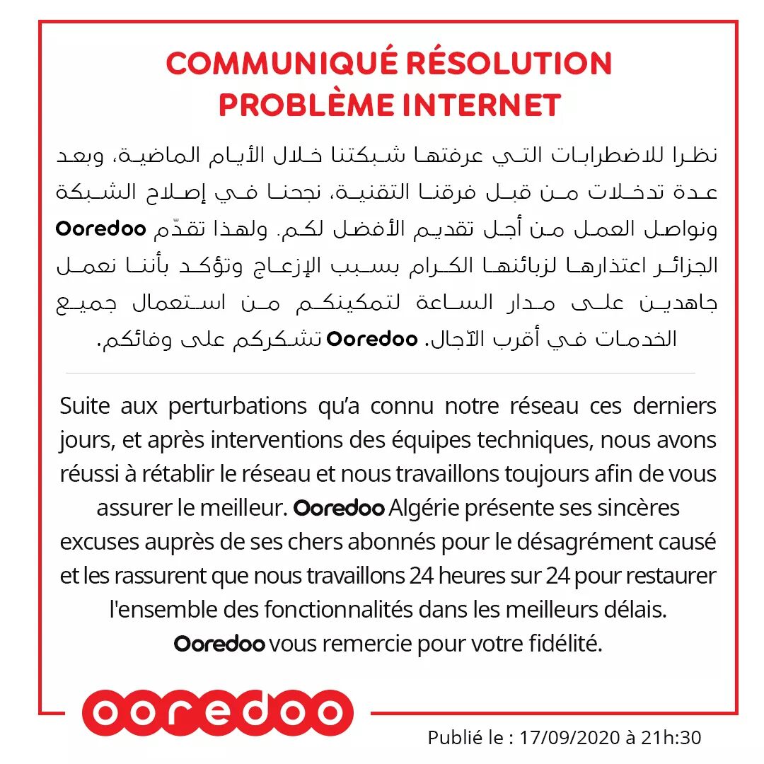 ووفق بيان لذات المتعامل، فإنه نظرا للإضطرابات التي عرفتها شبكة “أوريدو” خلال الأيام الأخيرة نجحنا في إصلاح الشبكة.
