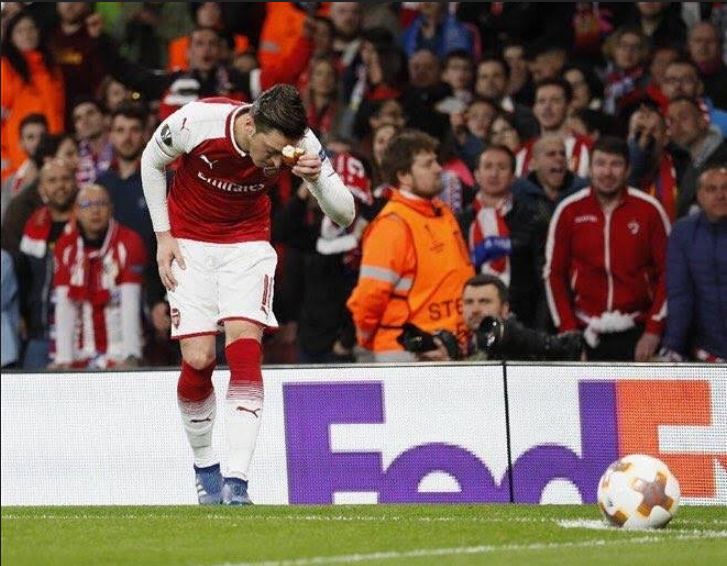 أوزيل يقبّل قطعة خبز ويبعدها جانبا خلال مباراة أتليتيكو