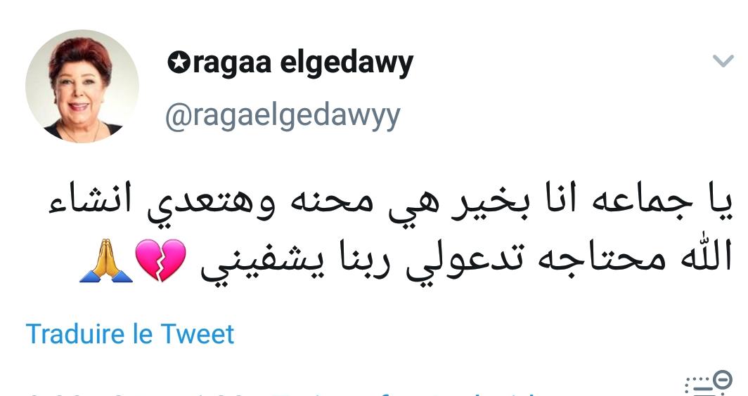 وغردت الفنانة على صفحتها بتويتر قائلة: “ياجماعة انا بخير، هي محنة وهتعدي إن شاء الله، محتاجة تدعولي ربنا يشفيني”.