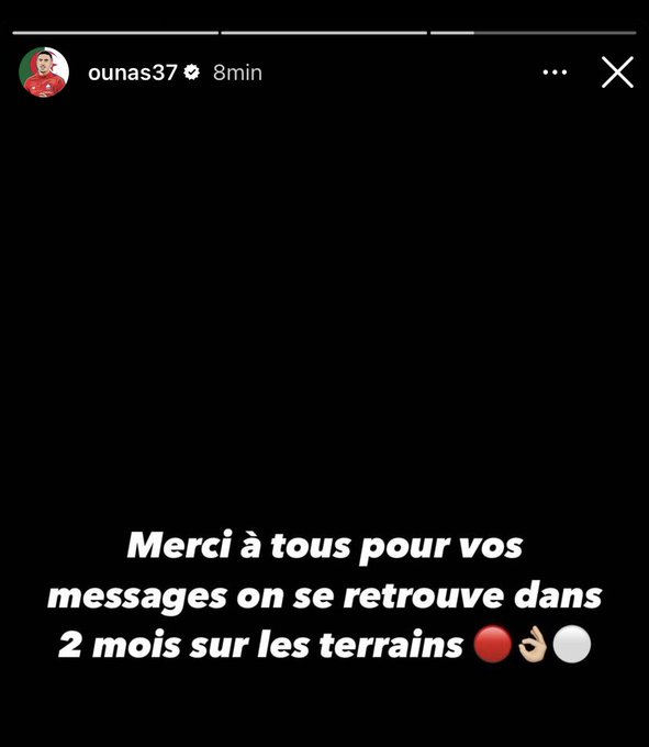 وأكّد آدم أوناس أنه سيعود إلى الملاعب بعد شهرين تقريبا، و في منشور له على صفحته الرسمية على “انستغرام” قال مهاجم الخضر “شكرا جميعا لكم على الرسائل، سأعود إلى الملاعب بعد شهرين”.