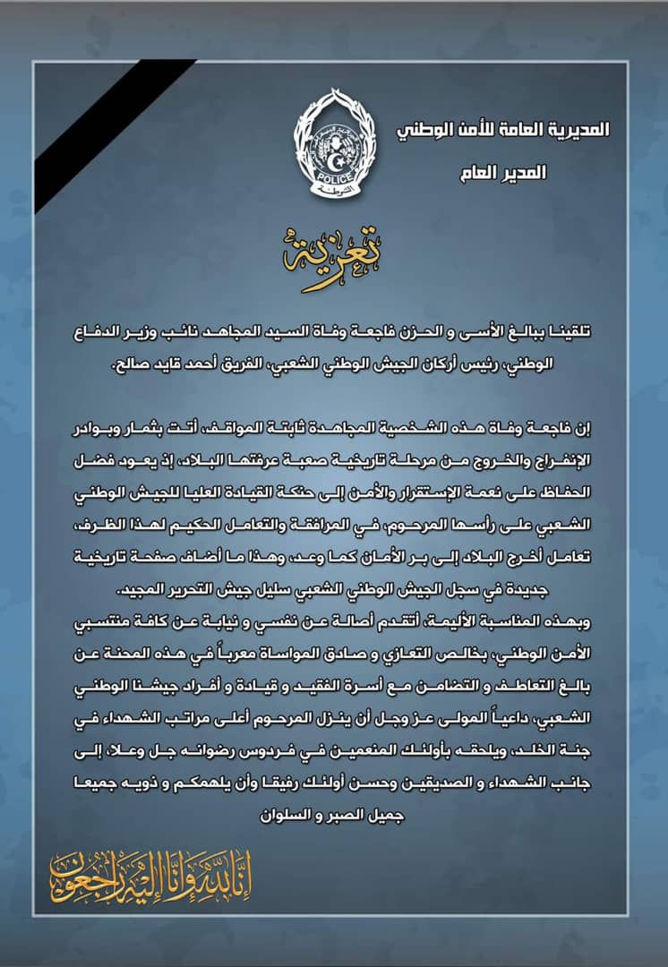 قدّم المدير العام للأمن الوطني أونيسي خليفة تعازيه الخالصة لعائلة الفقيد الفريق احمد ڨايد صالح الذي توفي اليوم عن عمر ناهز 79 سنة.