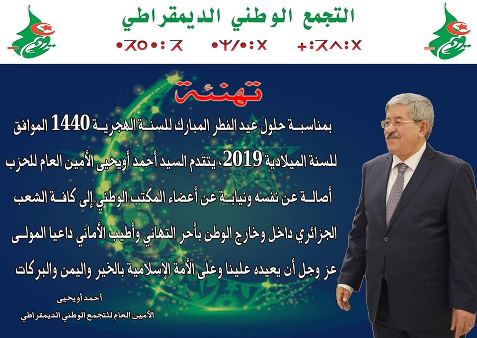 قدم الأمين العام للحزب التجمع الوطني الديموقراطي “أحمد أويحيى” تهانيه للجزائريين بمناسبة حلول عيد الفطر غدا الثلاثاء.