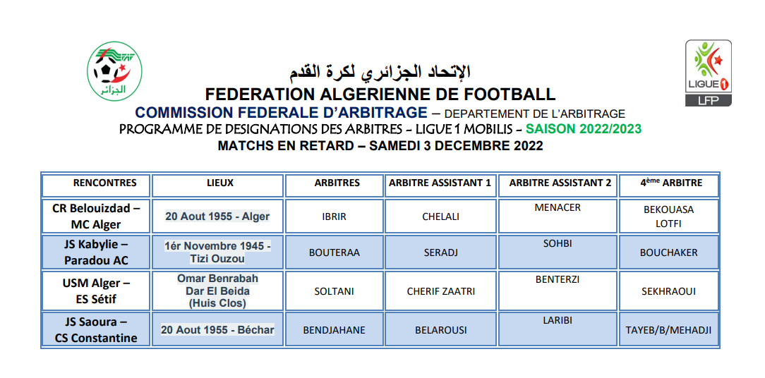 كما كشفت الفاف، عن باقي تعيينات حكام المباريات المتأخرة المبرمجة هذا السبت، والتي جاءت على النحو التالي: