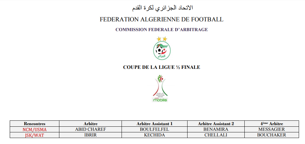 عينت اللجنة الفيدرالية للتحكيم، كل من الحكمين، إبرير وعبيد شارف، لإدارة مبارتي نصف نهائي كأس الرابطة.