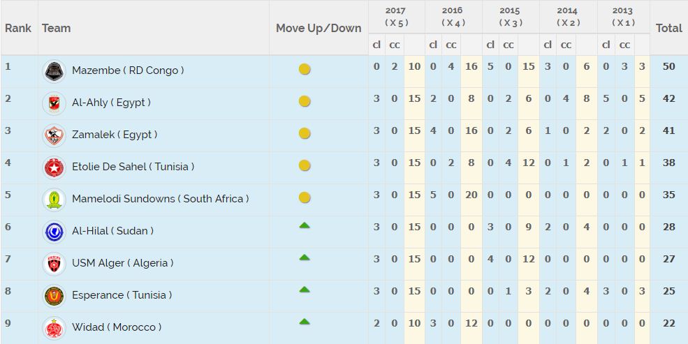 وتقدمت كتيبة “سوسطارة” على العديد من النوادي الكبيرة في صورة الترجي التونسي الذي جاء ثامنا ثم الوداد البيضاوي المغربي التاسع.