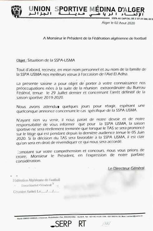 “تقوم إدارة اتحاد العاصمة بتتبع هذا الملف عن قرب حيث قامت بمراسلة لرئيس الفيدرالية الجزائرية لكرة القدم للتذكير أن الموسم الكروي 2019/2020 لم ينتهي بعد بالنسبة لفريق اتحاد العاصمة وهذا الى غاية صدور الحكم النهائي من طرف المحكمة الرياضية الدولية”.