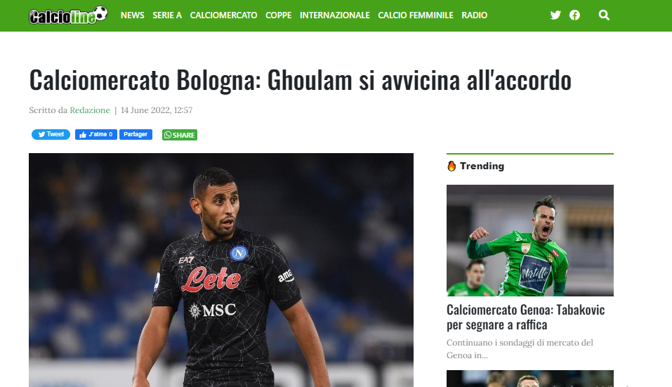 يذكر أن، فوزي غلام شارك بصفة غير منتظمة مع فريقه السابق نابولي في المواسم الأخيرة، بسبب لعنة الإصابات التي لاحقته منذ 2017.