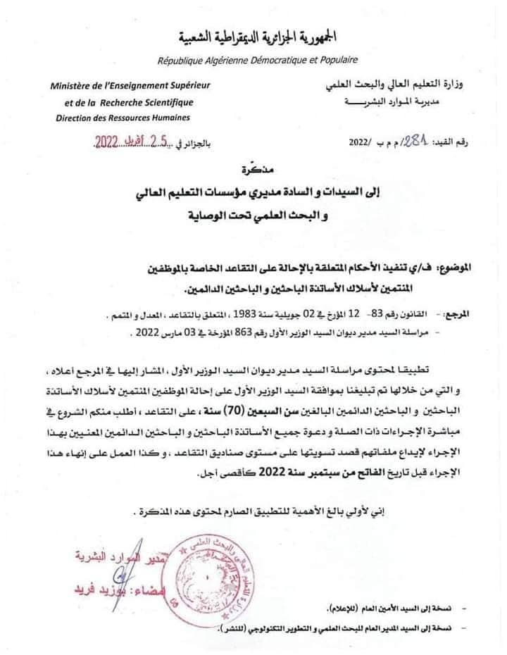 وحسب المراسلة رقم 281 بتاريخ 25 أفريل 2022، والتي تتضمن تنفيذ الأحكام المتعلقة بالتقاعد للموظفين المنتمين لأسلاك الأساتذة الباحثين، والباحثين الدائمين، تم إرسالها إلى جميع مديري مؤسسات التعليم العالي والبحث العلمي تحت الوصاية، تأمرهم بمباشرة الإجراءات ذات الصلة ودعوة الأساتذة الباحثين والباحثين الدائمين المعنيين بهذا الإجراء لإيداع ملفاتهم قصد تسويتها على صناديق التقاعد قبل الدخول الاجتماعي المقبل، وهذا تطبيقا لمحتوى مراسلة مدير ديوان الوزير الأوّل التي تحمل رقم 863 بتاريخ 3 مارس من السنة الجارية، والتي من خلالها تم تبليغ وزارة التعليم العالي بموافقة الوزير الأوّل على إحالة الموظفين المنتمين لأسلاك الأساتذة الباحثين والباحثين الدائمين البالغين سن سبعين سنة، على التقاعد، وقد حدد آخر أجل لإيداع هذه الملفات وإنهاء هذه الإجراء، قبل الفاتح من شهر سبتمبر 2022 كحد أقصى، وأمرت المراسلة بضرورة إيلاء أهمية بالغة لمحتواها، وتم توجيه مراسلة منها إلى كل من الأمين العام للوزارة للإعلام، ونسخة ثانية إلى المدير العام للبحث العلمي والتطوير التكنولوجي للنشر.