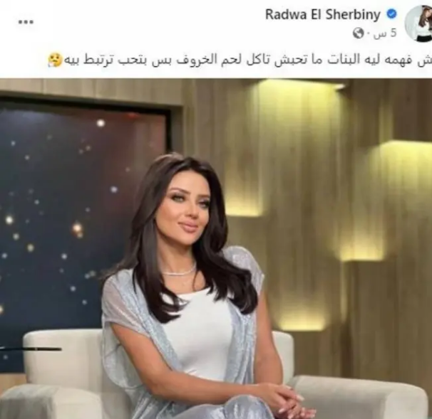وأثارت رضوى الشربيني جدلًا بعد نشرها صورة لها وعلقت عليها بسؤال وجهته للفتيات. قالت فيه: “مش فاهمة ليه البنات ما بتحبش تاكل لحم الخروف. بس بتحب ترتبط بيه”.