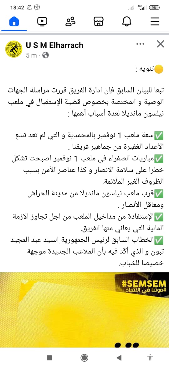 كشفت إدارة اتحاد الحراش عن أسباب إصرارها على مطلب الاستقبال بملعب نيلسون مانديلا ببراقي. بدلاً من معقل الفريق “1 نوفمبر” بالمحمدية.