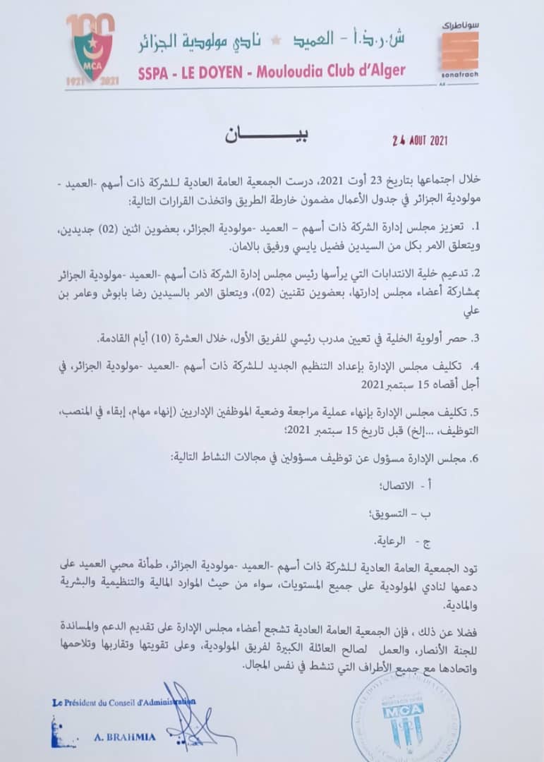 بالإضافة إلى تدعين خلية الإنتدابات التي يرأسها رئيس مجلس إدارة الشركة ذات أسهم مولودية الجزائر بمشاركة أعضاء مجلس إدارتها بعضوين تقنيين ويتعلق الأمر برضت بابوش وعامر بن علي، مع حصر أولوية الخلية في تعيين مدرب رئيسي للفريق الأول خلال عشرة أيام المقبلة.