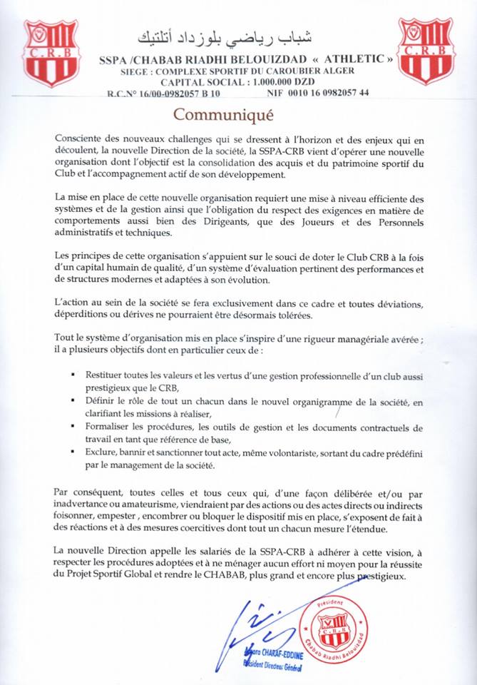 وهذا في بيان نشره النادي البلوزداد حدد من خلاله النظم الجديد المسيرة للفريق تحسباً للتحديات والمشروع الكبير للشركة.