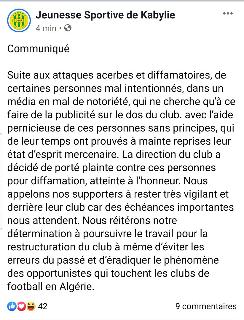 ونشرت إدارة شبيبة القبائل، عبر الحساب الرسمي للفريق على موقع التواصل الإجتماعي، بيان تؤكد من خلاله لجوؤها للقضاء.