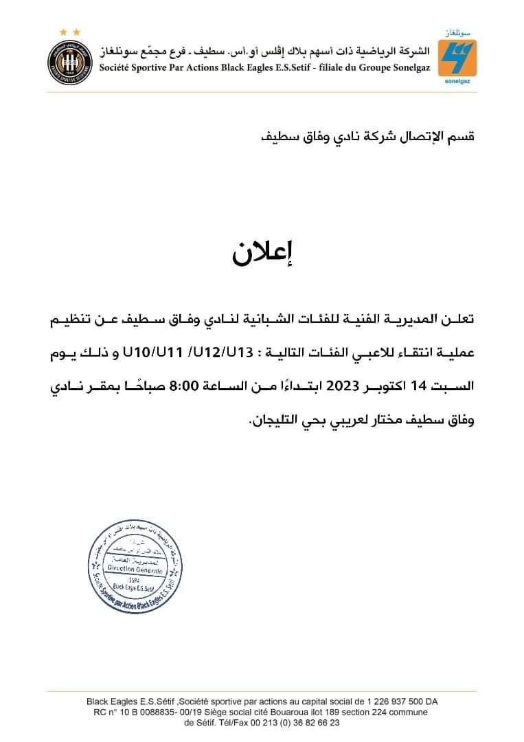 أعلنت إدارة فريق وفاق سطيف، عن برمجة مديرتها الفنية، لعملية انتقاء للاعبي الفئات الشبانية، قصد التحاقهم بالنادي.