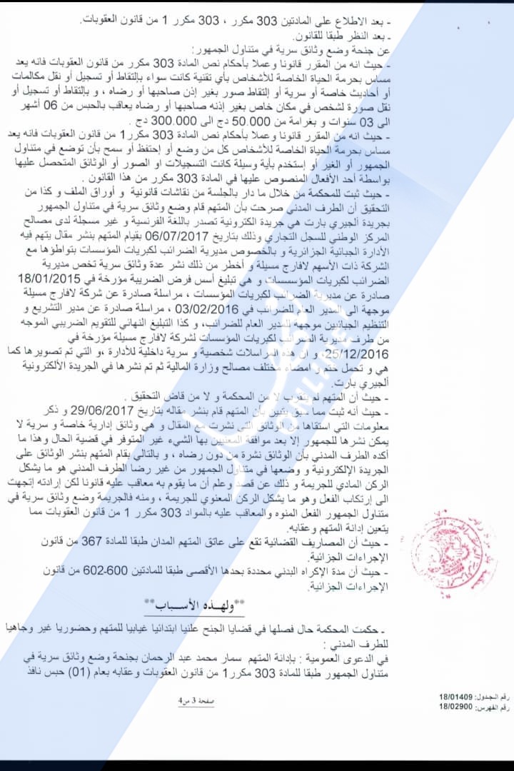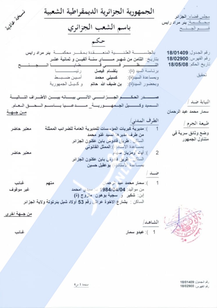 حيث أصدرت محكمة بئر مراد رايس حكمها بتاريخ 08 ماي 2018، بعدما تقدم مدير مديرية كبريات المؤسسات للمديرية العام للضرائب غنو محمد، بشكوى ضد عبدو سمار الذي قام بنشر وثائق سرية.