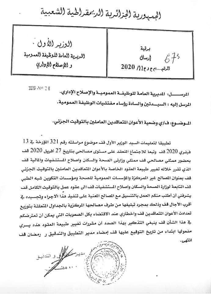 أبرقت المديرية العامة للوظيف العمومي برقية من أجل إدماج الأعوان المتعاقدين بالتوقيت الجزئي في قطاع الصحة في التوقيت الكامل.