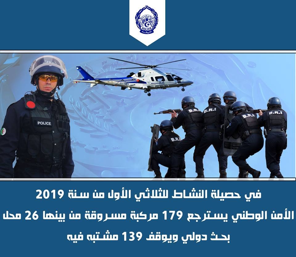 إسترجعت مصالح الشرطة خلال الثلاثي الأول لـ2019، عبر48 ولاية 179مركبة محل سرقة، من بينها 26سيارة مبحوث عنها من طرف الأنتربول.