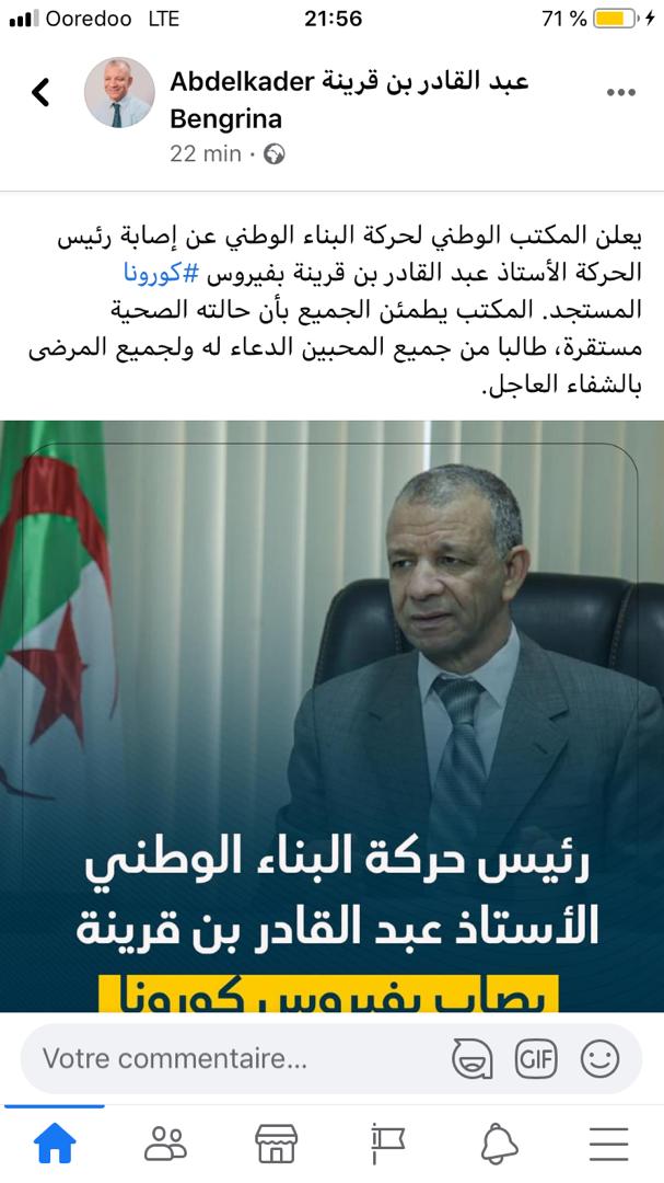 أصيب رئيس حركة البناء الوطني، عبد القادر بن قرينة، بفيروس كورونا المستجد كوفيد-19، حسب ما أعلن عنه المكتب الوطني للحركة.