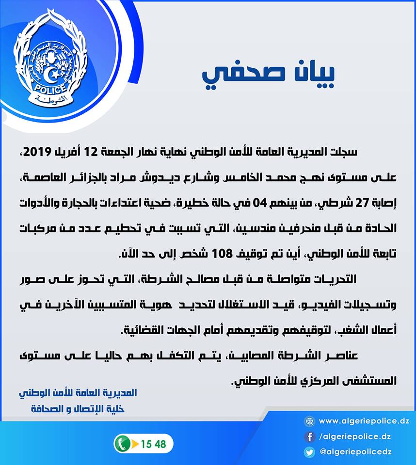 أعلنت المديرية العامة للأمن الوطني عن إصابة 27 شرطي ،4 منهم في حالة خطيرة، خلال المظاهرات بحي ديديوش مراد بالعاصمة.