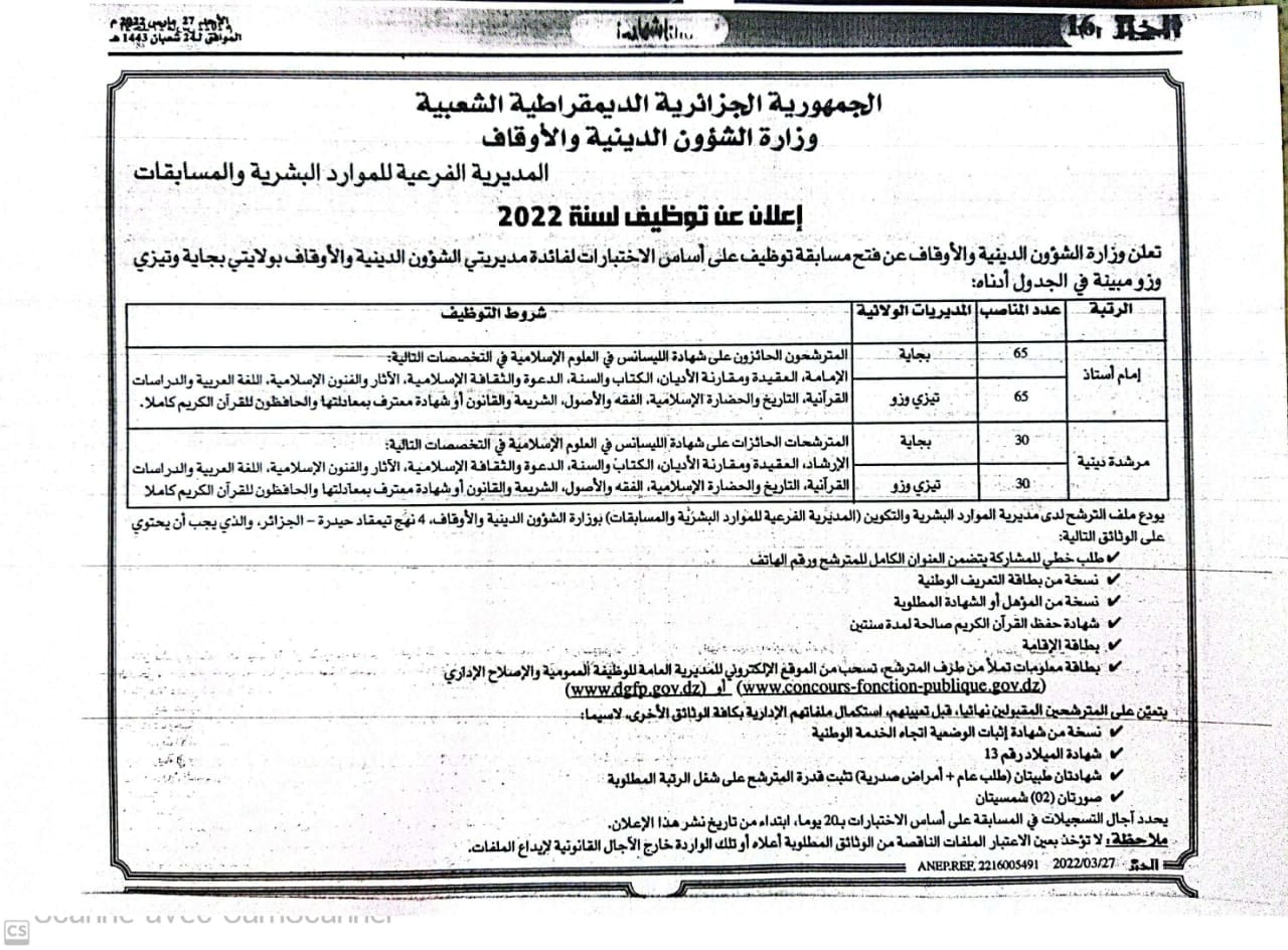 وحسب بيان للوزارة، فقد تم إطلاق هذه المسابقة لفائدة مديريتي الشؤون الدينية والأوقاف بولايتي بجاية وتيزي وزو.