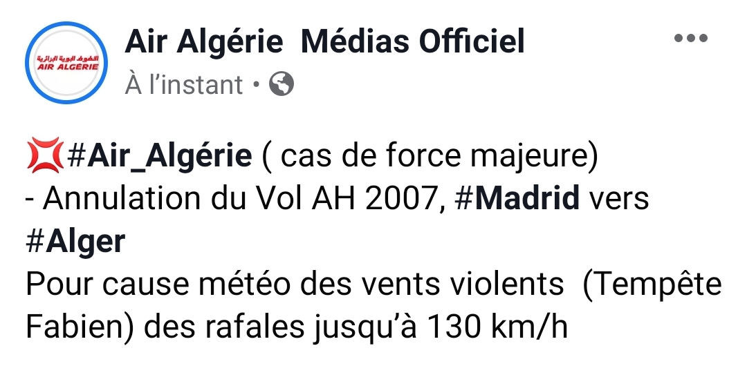 أعلنت الجوية الجزائرية االيوم السبت عن الغاء رحلة جوية انطلاقا من مدريد الإسبانية نحو الجزائر بسب سوء الاحوال الجوية.