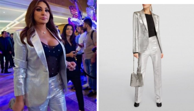 وأطلت إليسا ببدلة بلون فضي لامع من تصميم PACO RABBANE ويصل سعر البلايزر إلى 1559 دولار. ومعه بنطلون من نفس الخامة واللون ويصل سعره إلى 1290 دولار إأمريكي.