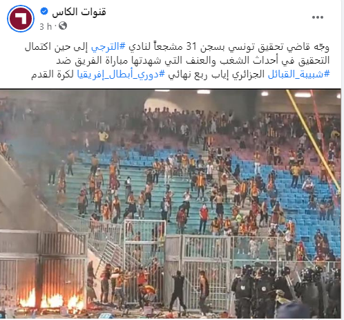 كشف موقع “الكأس” القطري عن توجيه قاضي تحقيق تونسي بسجن 31 مشجّعا لنادي الترجي التونسي على إثر الأحداث الذين تسبّبوا فيها خلال مباراة “المكشخة” وشبيبة القبائل.
