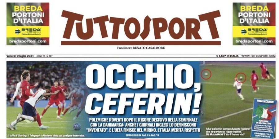 وبعد الهدية التي منحت للمنتخب الإنجليزي بالرغم من وجود تقنية الـ “VAR” والتي تأهل على إثرها منتخب الأسود الثلاث لنهائي “يورو 2020″، طالبت إيطاليا وعبر مختلف صحفها من رئيس الاتحاد الأوروبي بـ “فتح عينيه جيدا” وإحترام أكبر للأتزوري.