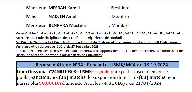 قررت لجنة الانضباط التابعة للرابطة المحترفة لكرة القدم، إيقاف حارس اتحاد خنشلة، أسامة ليتيم، لـ 6 لقاءات منها 3 غير نافذة.
