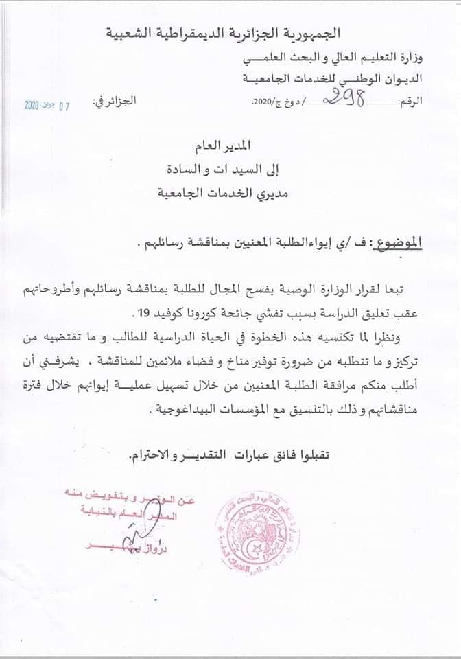 كما طالبت الوزارة بتوفير لهم مناخ وفضاء ملائمين للمناقشة مع تسهيل عملية الإيواء لمناقشة رسائلهم واطروحاتهم.
