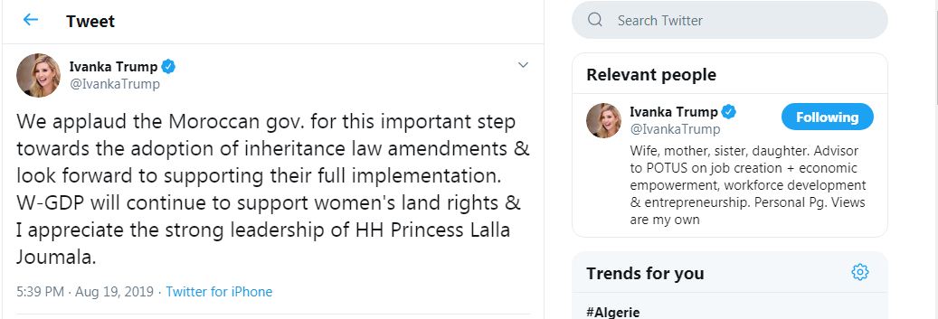 وبدا من خلال تغريدة إيفانكا أن مساعي فرض المساواة بين حقوق الرجل والمرأة في الميراث بالمغرب تقف وراءها الأميرة “جُمالة”.