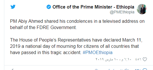 وغرّد حساب مكتب رئيس الوزراء أبي أحمد على موقع “تويتر” قائلا: ” أعلن مجلس النواب يوم 11 مارس من عام 2019، يوم حداد وطني