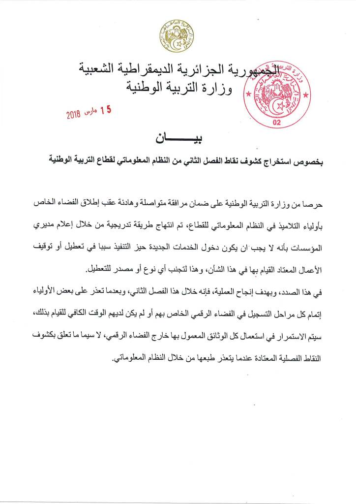 وجاء هذا القرار لتجنب أي تعطيل، وسيتم استلام كشوف النقاط بالطريقة التقليدية وهذا بالاستمرار في استعمال كل الوثائق المعمول بها خارج الفضاء الرقمي.